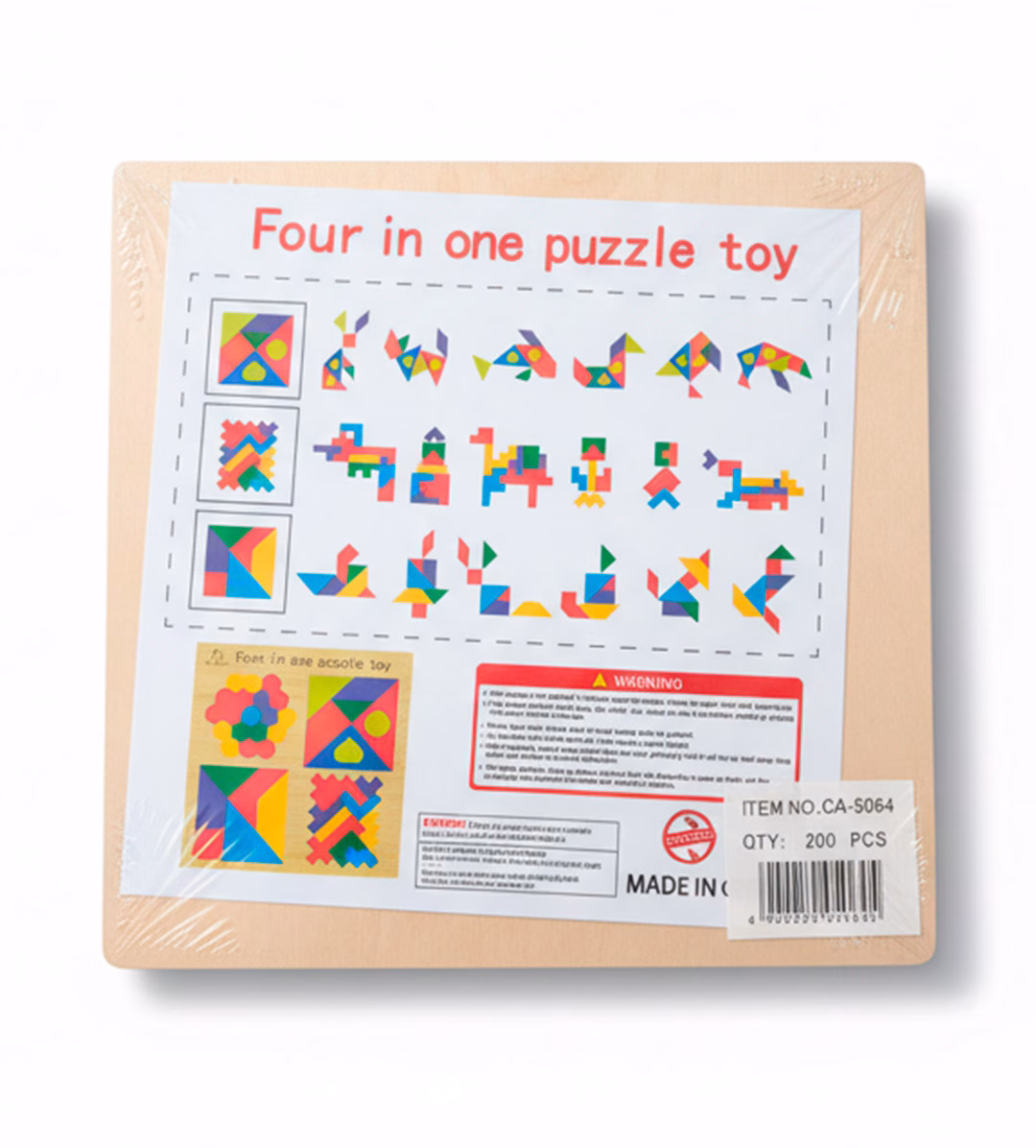 Juego educativo de madera que permite a los niños explorar formas, colores y patrones mediante la construcción de diferentes figuras. Este material incluye cuatro puzzles distintos en un solo tablero, lo que estimula el pensamiento lógico, la creatividad y la resolución de problemas.